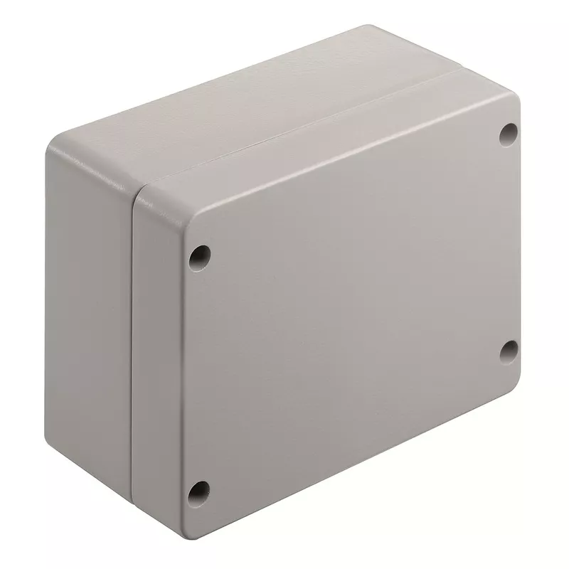 Obudowa metalowa do zastosowań przemysłowych. Otwory mocujące znajdują się poza uszczelnionym obszarem. Montaż ścienny można uzyskać za pomocą otworów montażowych lub nóżek montażowych.