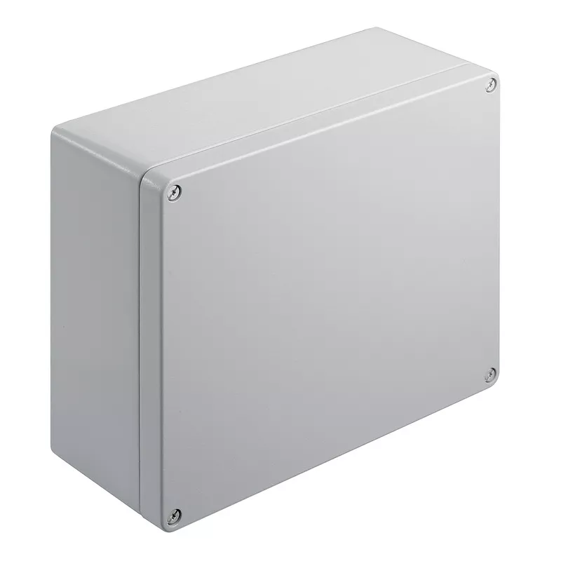 Obudowa metalowa do zastosowań przemysłowych. Otwory mocujące znajdują się poza uszczelnionym obszarem. Montaż ścienny można uzyskać za pomocą otworów montażowych lub nóżek montażowych.