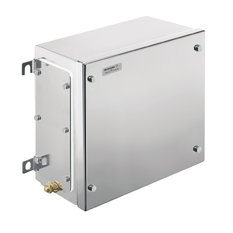 Zmontowana obudowa do stref zagrożenia wybuchem. Otwory mocujące znajdują się poza uszczelnionym obszarem. Montaż ścienny można uzyskać za pomocą otworów montażowych lub nóżek montażowych.