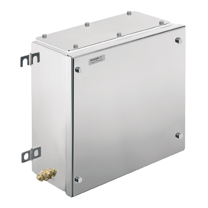 Zmontowana obudowa do stref zagrożenia wybuchem. Otwory mocujące znajdują się poza uszczelnionym obszarem. Montaż ścienny można uzyskać za pomocą otworów montażowych lub nóżek montażowych.