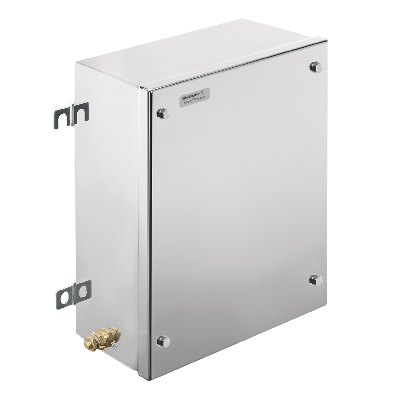 Zmontowana obudowa do stref zagrożenia wybuchem. Otwory mocujące znajdują się poza uszczelnionym obszarem. Montaż ścienny można uzyskać za pomocą otworów montażowych lub nóżek montażowych.