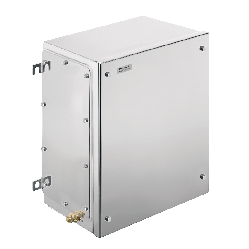 Zmontowana obudowa do stref zagrożenia wybuchem. Otwory mocujące znajdują się poza uszczelnionym obszarem. Montaż ścienny można uzyskać za pomocą otworów montażowych lub nóżek montażowych.
