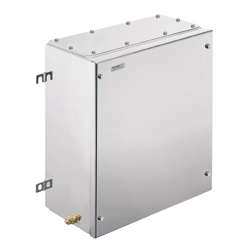 Zmontowana obudowa do stref zagrożenia wybuchem. Otwory mocujące znajdują się poza uszczelnionym obszarem. Montaż ścienny można uzyskać za pomocą otworów montażowych lub nóżek montażowych.