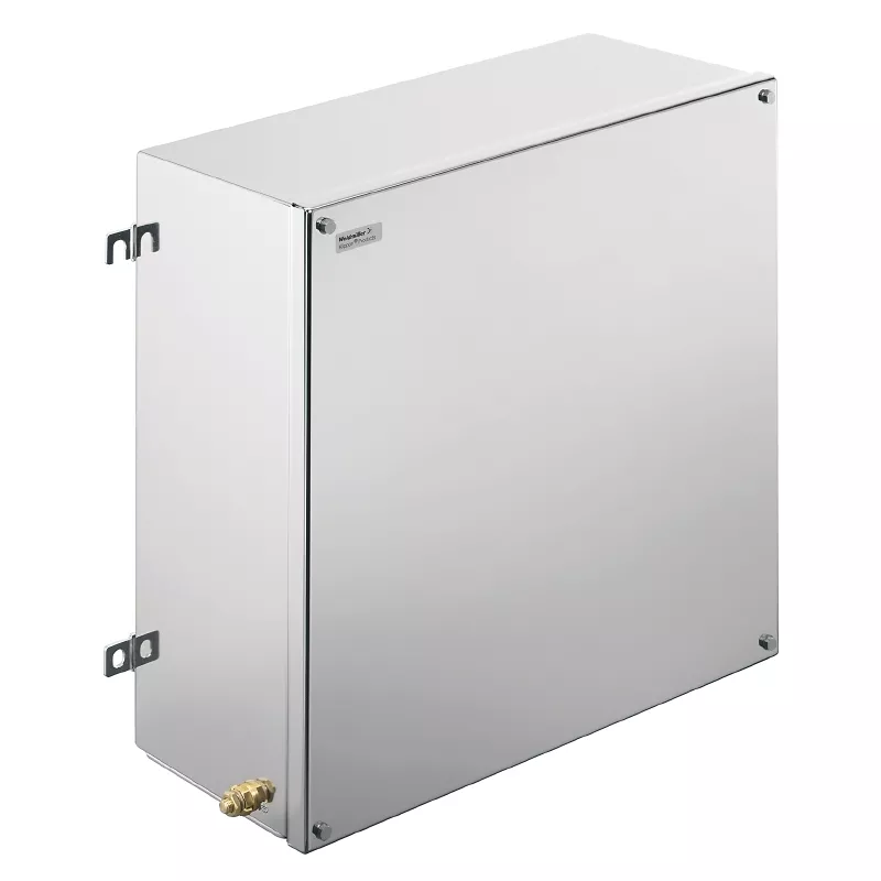 Zmontowana obudowa do stref zagrożenia wybuchem. Otwory mocujące znajdują się poza uszczelnionym obszarem. Montaż ścienny można uzyskać za pomocą otworów montażowych lub nóżek montażowych.