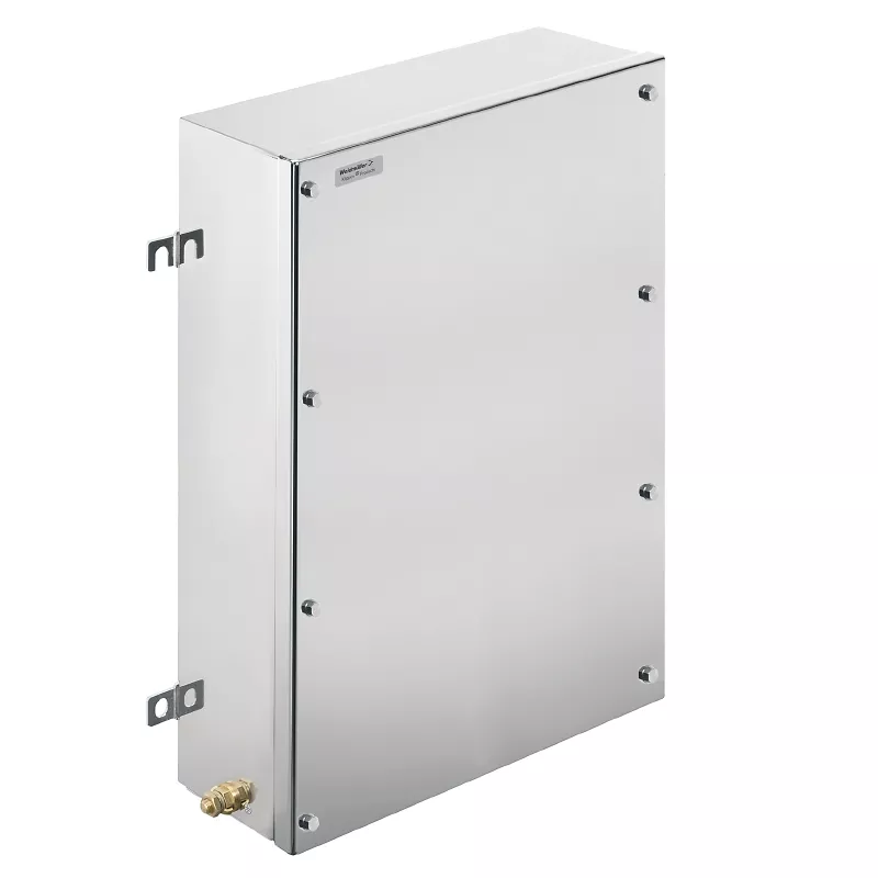 Zmontowana obudowa do stref zagrożenia wybuchem. Otwory mocujące znajdują się poza uszczelnionym obszarem. Montaż ścienny można uzyskać za pomocą otworów montażowych lub nóżek montażowych.