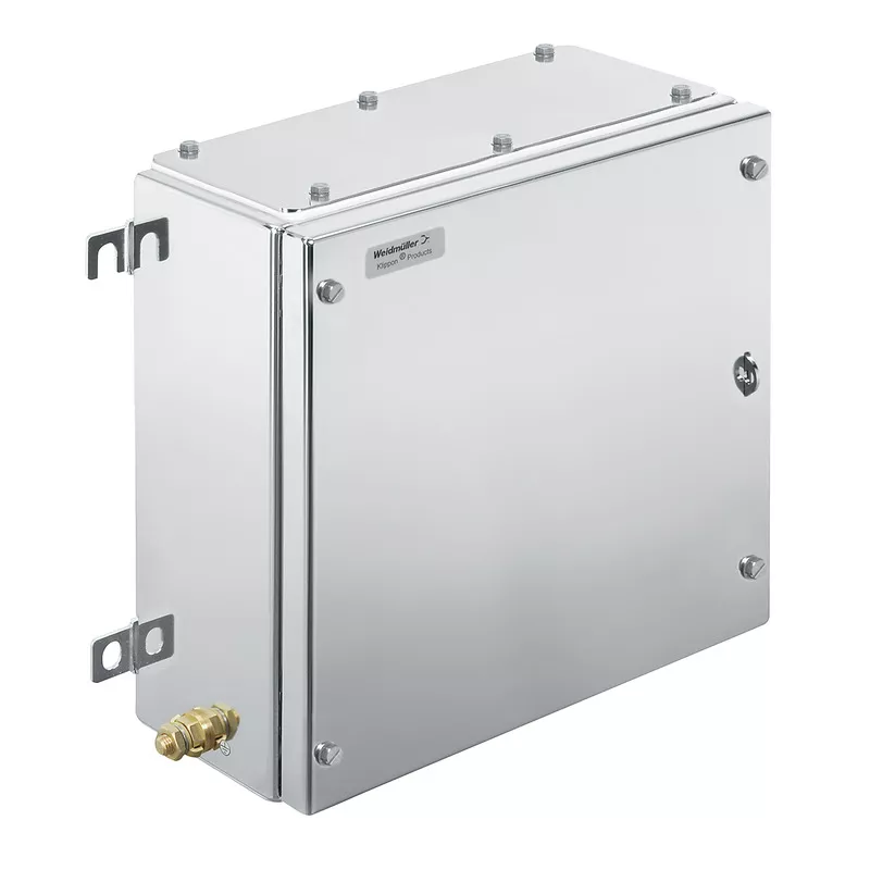 Zmontowana obudowa do stref zagrożenia wybuchem. Otwory mocujące znajdują się poza uszczelnionym obszarem. Montaż ścienny można uzyskać za pomocą otworów montażowych lub nóżek montażowych.