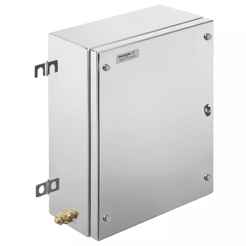 Zmontowana obudowa do stref zagrożenia wybuchem. Otwory mocujące znajdują się poza uszczelnionym obszarem. Montaż ścienny można uzyskać za pomocą otworów montażowych lub nóżek montażowych.