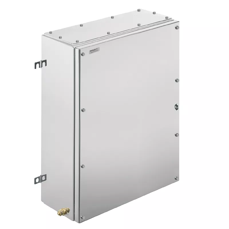 Zmontowana obudowa do stref zagrożenia wybuchem. Otwory mocujące znajdują się poza uszczelnionym obszarem. Montaż ścienny można uzyskać za pomocą otworów montażowych lub nóżek montażowych.