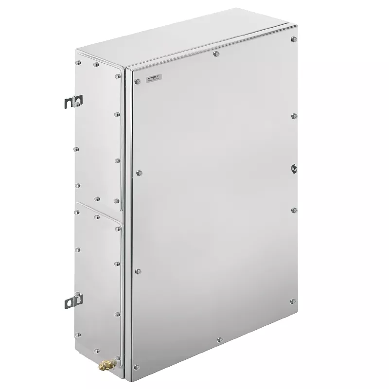 Zmontowana obudowa do stref zagrożenia wybuchem. Otwory mocujące znajdują się poza uszczelnionym obszarem. Montaż ścienny można uzyskać za pomocą otworów montażowych lub nóżek montażowych.
