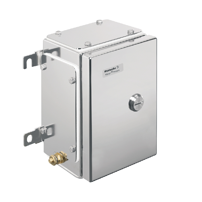 Zmontowana obudowa do stref zagrożenia wybuchem. Otwory mocujące znajdują się poza uszczelnionym obszarem. Montaż ścienny można uzyskać za pomocą otworów montażowych lub nóżek montażowych.