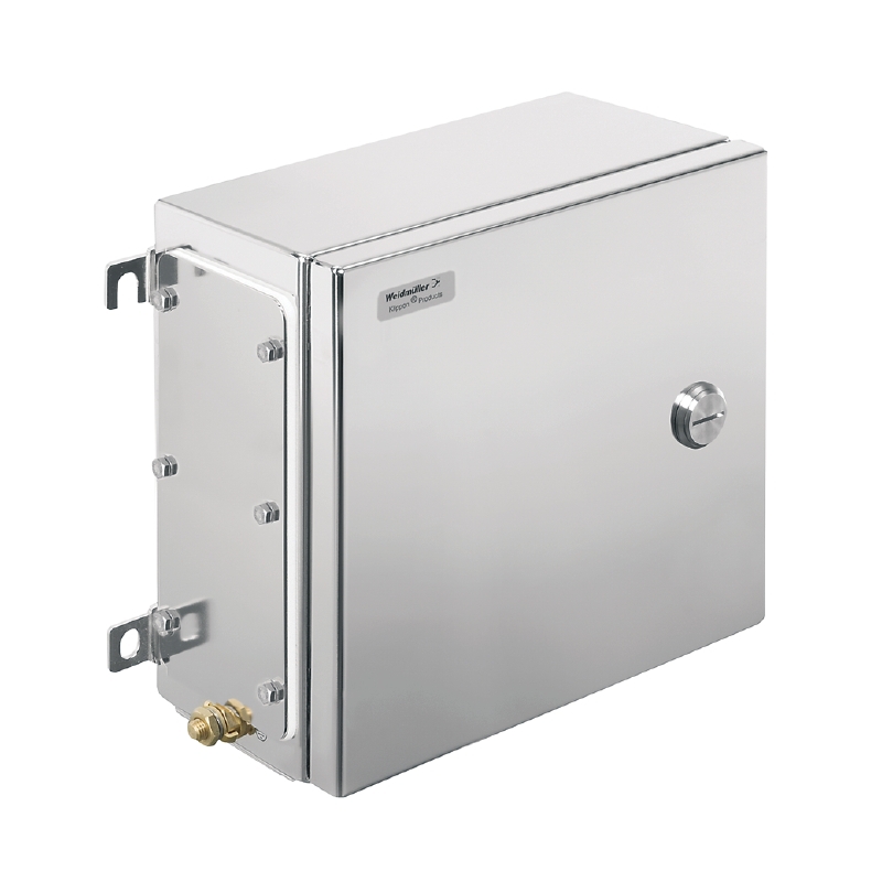 Zmontowana obudowa do stref zagrożenia wybuchem. Otwory mocujące znajdują się poza uszczelnionym obszarem. Montaż ścienny można uzyskać za pomocą otworów montażowych lub nóżek montażowych.