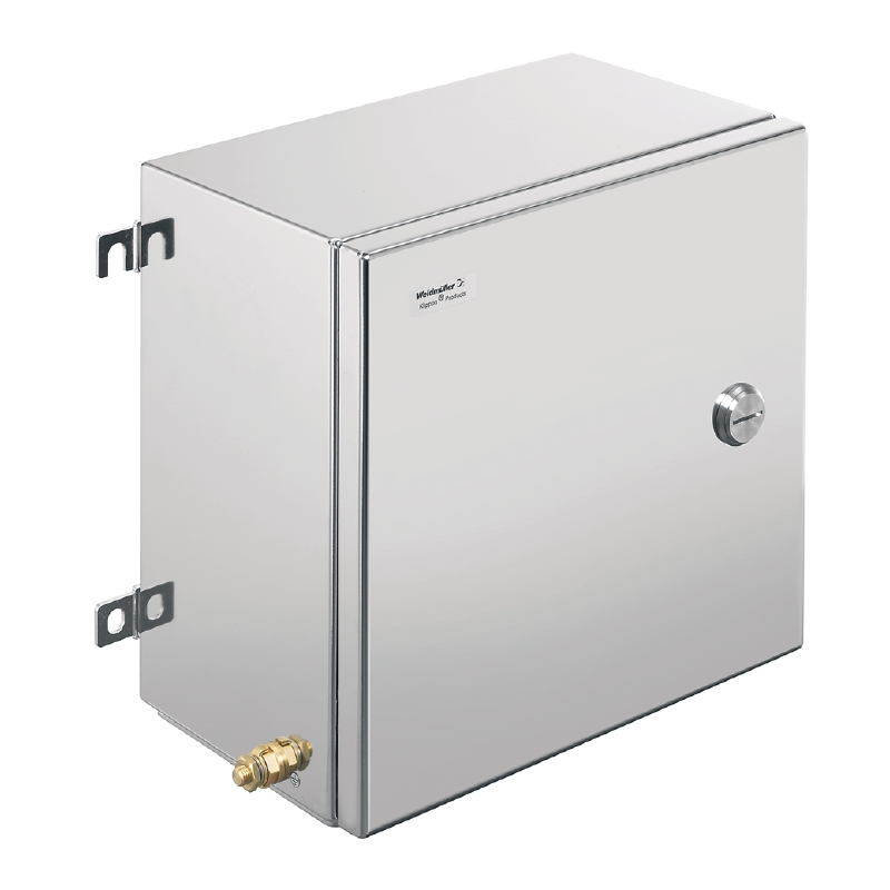 Zmontowana obudowa do stref zagrożenia wybuchem. Otwory mocujące znajdują się poza uszczelnionym obszarem. Montaż ścienny można uzyskać za pomocą otworów montażowych lub nóżek montażowych.