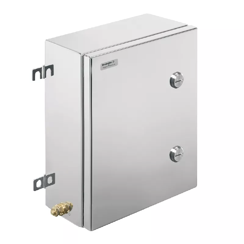 Zmontowana obudowa do stref zagrożenia wybuchem. Otwory mocujące znajdują się poza uszczelnionym obszarem. Montaż ścienny można uzyskać za pomocą otworów montażowych lub nóżek montażowych.