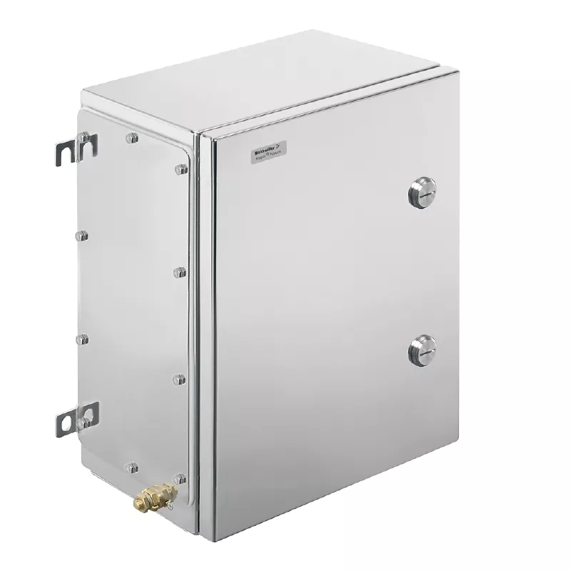 Zmontowana obudowa do stref zagrożenia wybuchem. Otwory mocujące znajdują się poza uszczelnionym obszarem. Montaż ścienny można uzyskać za pomocą otworów montażowych lub nóżek montażowych.