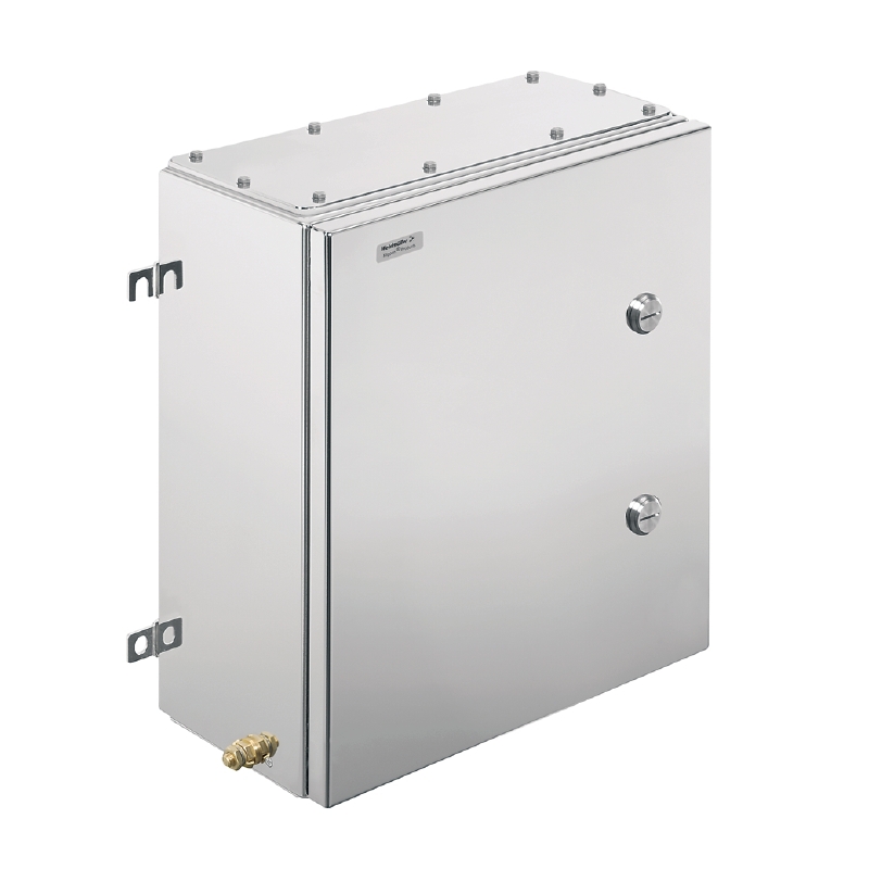 Zmontowana obudowa do stref zagrożenia wybuchem. Otwory mocujące znajdują się poza uszczelnionym obszarem. Montaż ścienny można uzyskać za pomocą otworów montażowych lub nóżek montażowych.