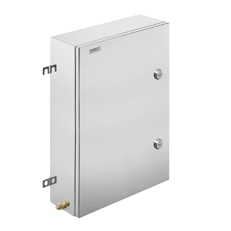 Zmontowana obudowa do stref zagrożenia wybuchem. Otwory mocujące znajdują się poza uszczelnionym obszarem. Montaż ścienny można uzyskać za pomocą otworów montażowych lub nóżek montażowych.