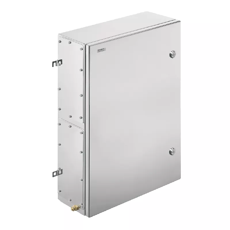 Zmontowana obudowa do stref zagrożenia wybuchem. Otwory mocujące znajdują się poza uszczelnionym obszarem. Montaż ścienny można uzyskać za pomocą otworów montażowych lub nóżek montażowych.