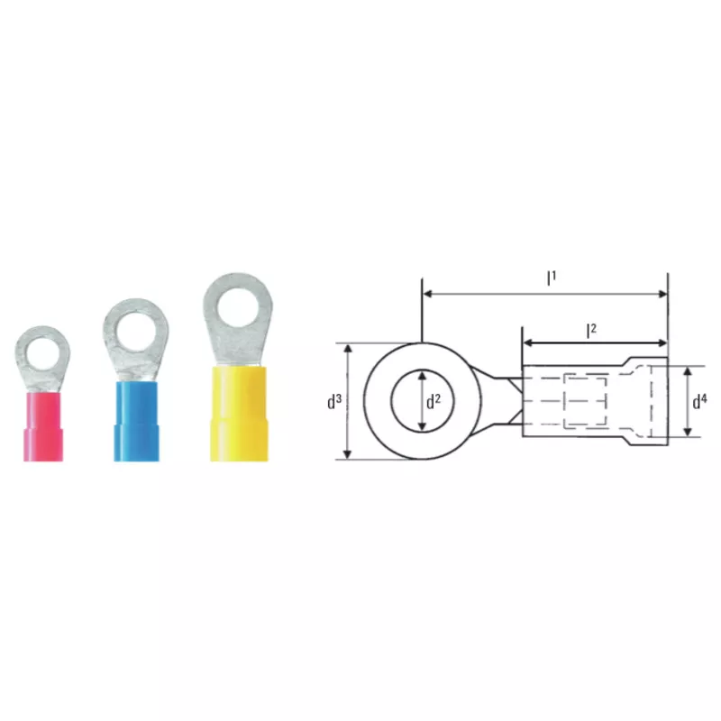 Izolowane, miedziane okrągłe zaciski kablowe ze stożkową tuleją przewodu.