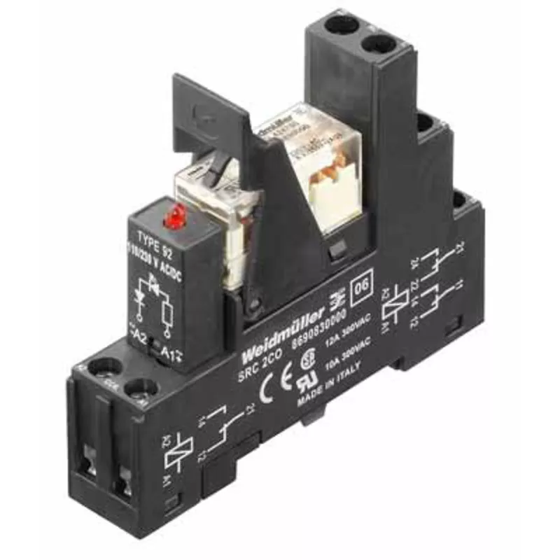 Zastaw przekaźnika wtykowego i złącza żeńskiego. Obwód sterowania i obciążenia wtórnego posiadają izolację elektryczną.