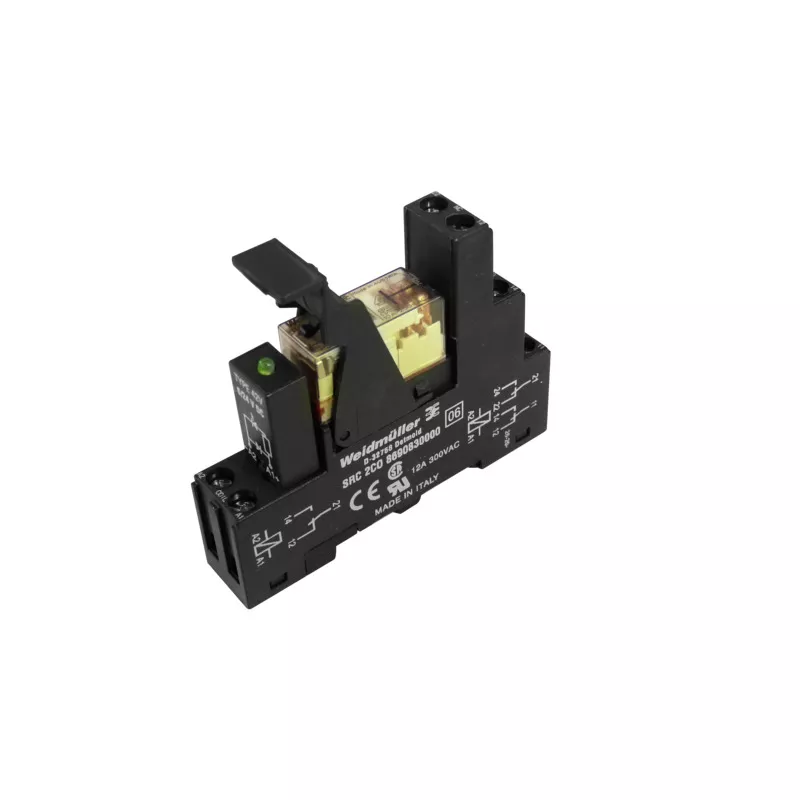 Zastaw przekaźnika wtykowego i złącza żeńskiego. Obwód sterowania i obciążenia wtórnego posiadają izolację elektryczną.