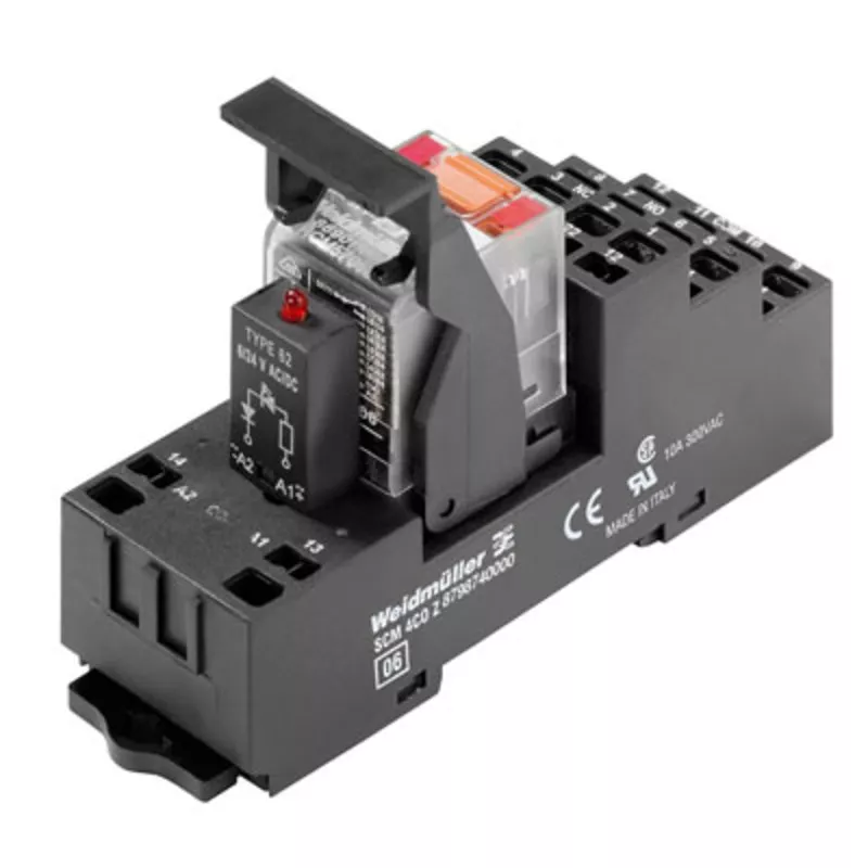 Zastaw przekaźnika wtykowego i złącza żeńskiego. Obwód sterowania i obciążenia wtórnego posiadają izolację elektryczną.