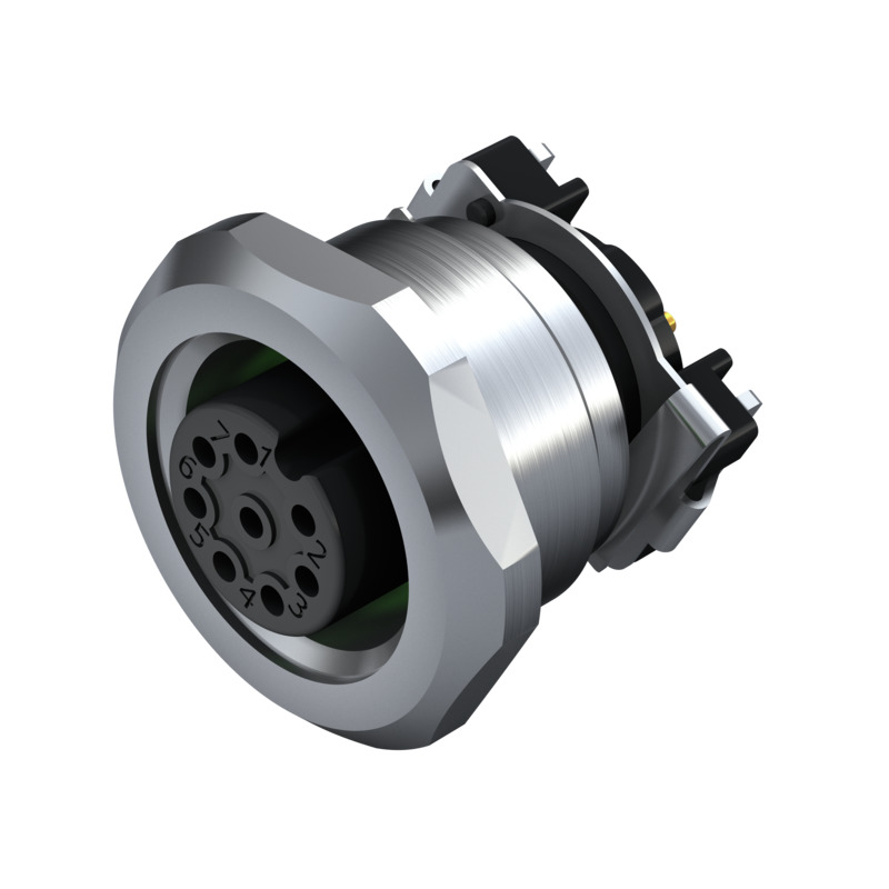 Okrągłe złącze do przesyłu prądu. Złącze wtykowe jest lutowane bezpośrednio na PCB. Kompaktowa konstrukcja z dużą gęstością prądu.