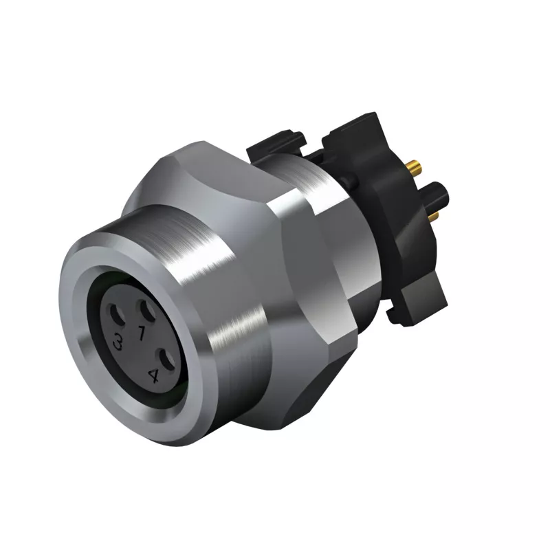Okrągłe złącze do przesyłu prądu. Złącze wtykowe jest lutowane bezpośrednio na PCB. Kompaktowa konstrukcja z dużą gęstością prądu.