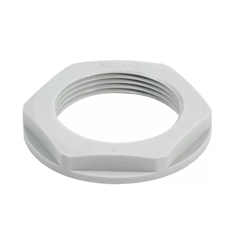 Nakrętka blokująca zabezpieczająca przepusty kablowe wykonane z tworzywa sztucznego.
