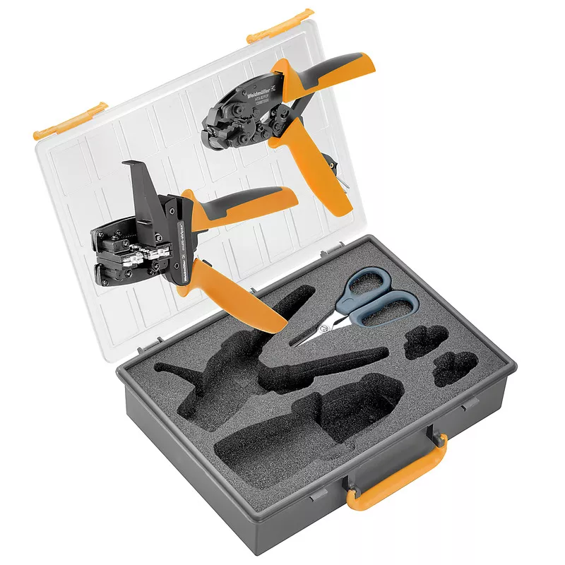 Kompletny zestaw do połączeń zaciskowych, składający się z narzędzia zaciskowego, narzędzia do usuwania izolacji oraz materiałów eksploatacyjnych.