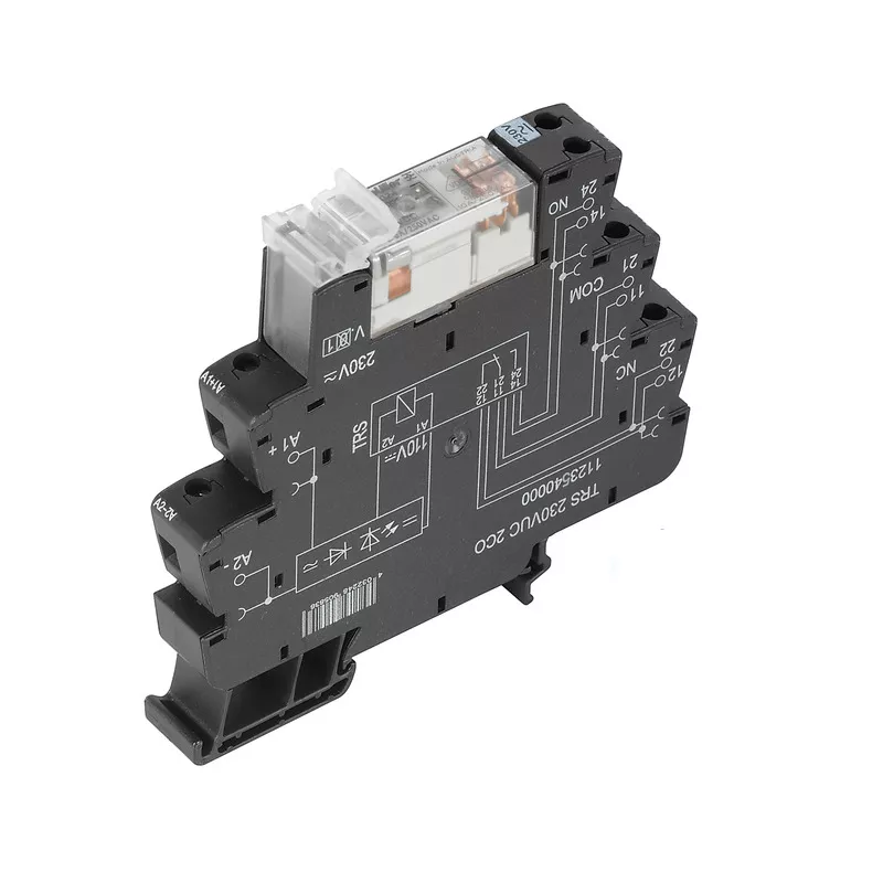 Zastaw przekaźnika wtykowego i złącza żeńskiego. Obwód sterowania i obciążenia wtórnego posiadają izolację elektryczną.