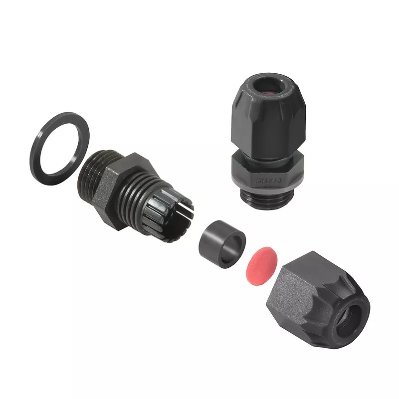 Dławnica kablowa wykonana za tworzywa sztucznego używana do plombowania obudowy podczas wkładania przewodów. Z odciążeniem. Odpowiednie do eksploatacji w strefach zagrożenia wybuchem.