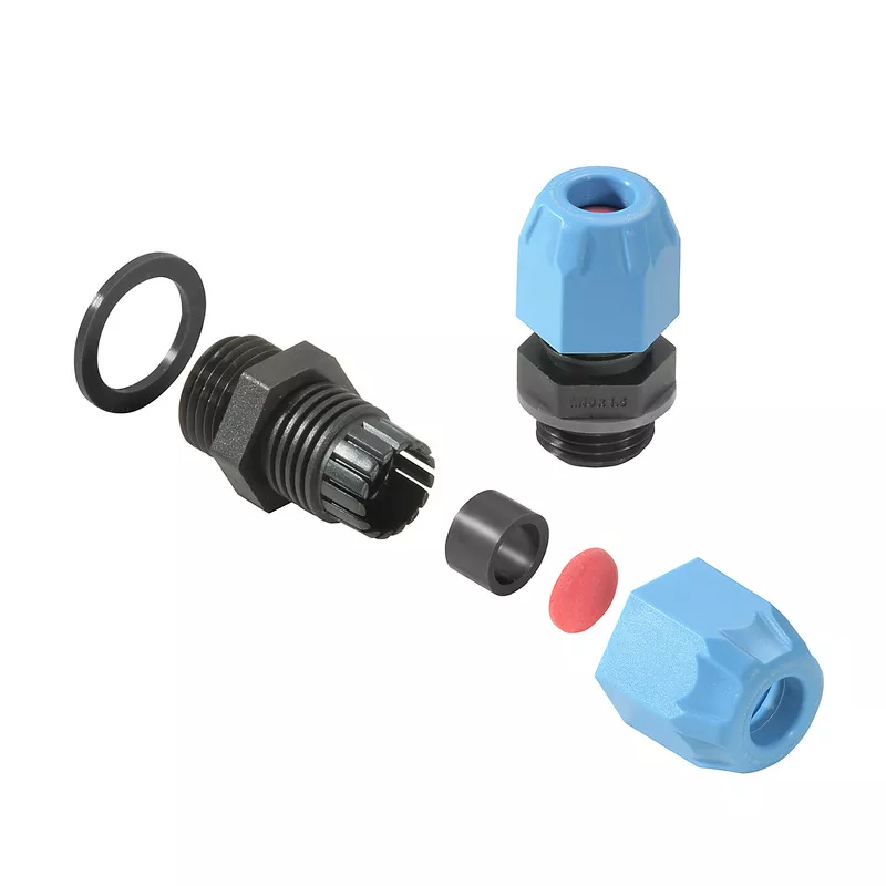 Dławnica kablowa wykonana za tworzywa sztucznego używana do plombowania obudowy podczas wkładania przewodów. Z odciążeniem. Odpowiednie do eksploatacji w strefach zagrożenia wybuchem.