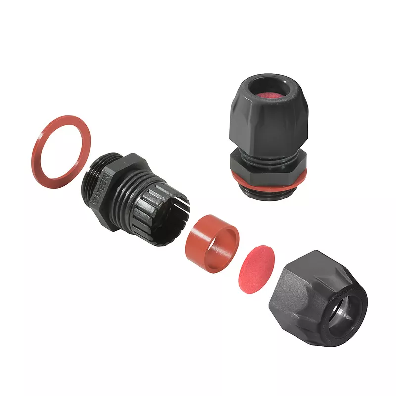 Dławnica kablowa wykonana za tworzywa sztucznego używana do plombowania obudowy podczas wkładania przewodów. Z odciążeniem. Odpowiednie do eksploatacji w strefach zagrożenia wybuchem.