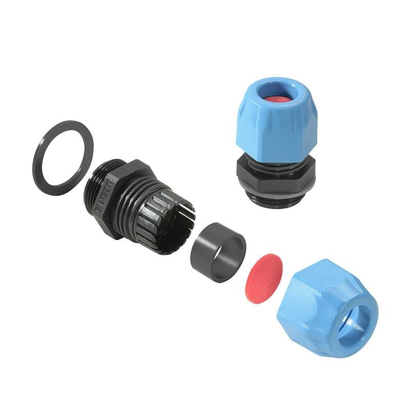 Dławnica kablowa wykonana za tworzywa sztucznego używana do plombowania obudowy podczas wkładania przewodów. Z odciążeniem. Odpowiednie do eksploatacji w strefach zagrożenia wybuchem.