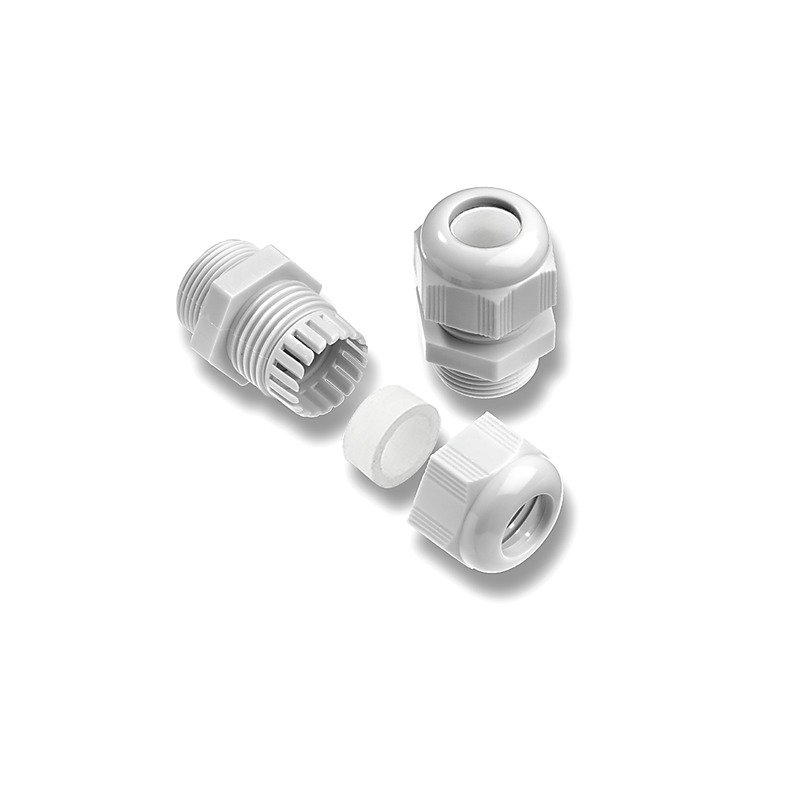 Dławnica kablowa wykonana za tworzywa sztucznego używana do plombowania obudowy podczas wkładania przewodów. Z odciążeniem.