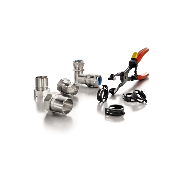 Metalowa dławnica kablowa używana do plombowania obudowy podczas wkładania przewodów. Z odciążeniem.
