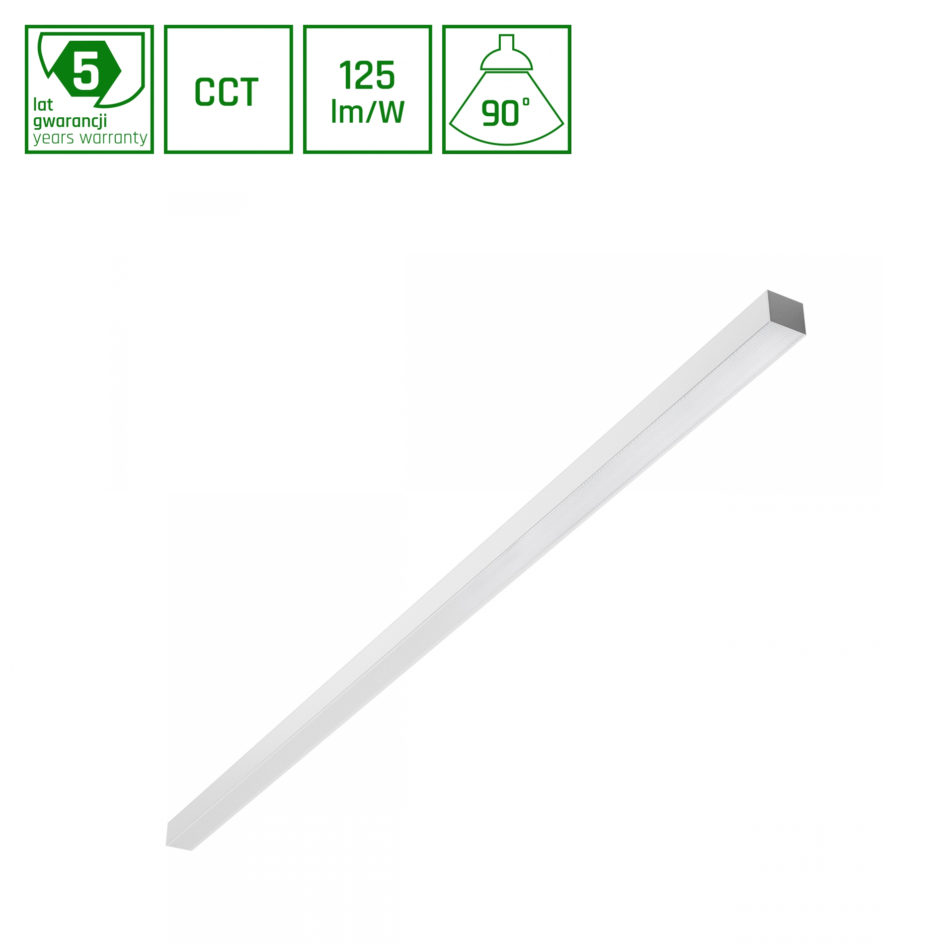 Parametr Wartość Moc 50 W Prąd znamionowy 220 mA Napięcie wejściowe 230 V Częstotliwość 50HZ Hz Limeny 5000 lm Kolor światła CCT Wymiary A x B x C 1503x42x37 mm Kąt światła 90 ° Klasa EEI EPREL E Klasa IP IP20 Długość życia 50000 h Gwarancja 5 y Zakres temperatur -20/+40 °C Materiał ALUMINIUM Możliwość ściemniania NIE Kolor BIAŁY Zastosowanie WEW Dołączone źródło zasilania TAK Temperatura barwowa 2700/4000/6000 K Oprawa zawiera źródło światła TAK UGR współczynnik olśnienia UGR<19 Klasa ochrony I Sposób montażu NATYNKOWY/ZWIESZANY Box length 1540 mm Box width 47 mm Box height 42 mm Useful luminous flux 6250 lm Useful luminous flux angle 360 °