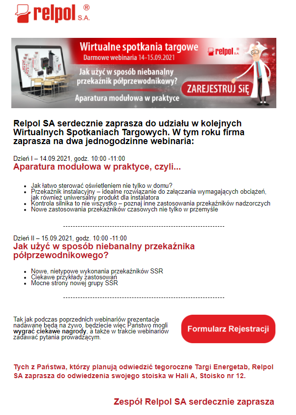 Relpol SA serdecznie zaprasza do udziału w kolejnych Wirtualnych Spotkaniach Targowych. W tym roku firma zaprasza na dwa jednogodzinne webinaria: